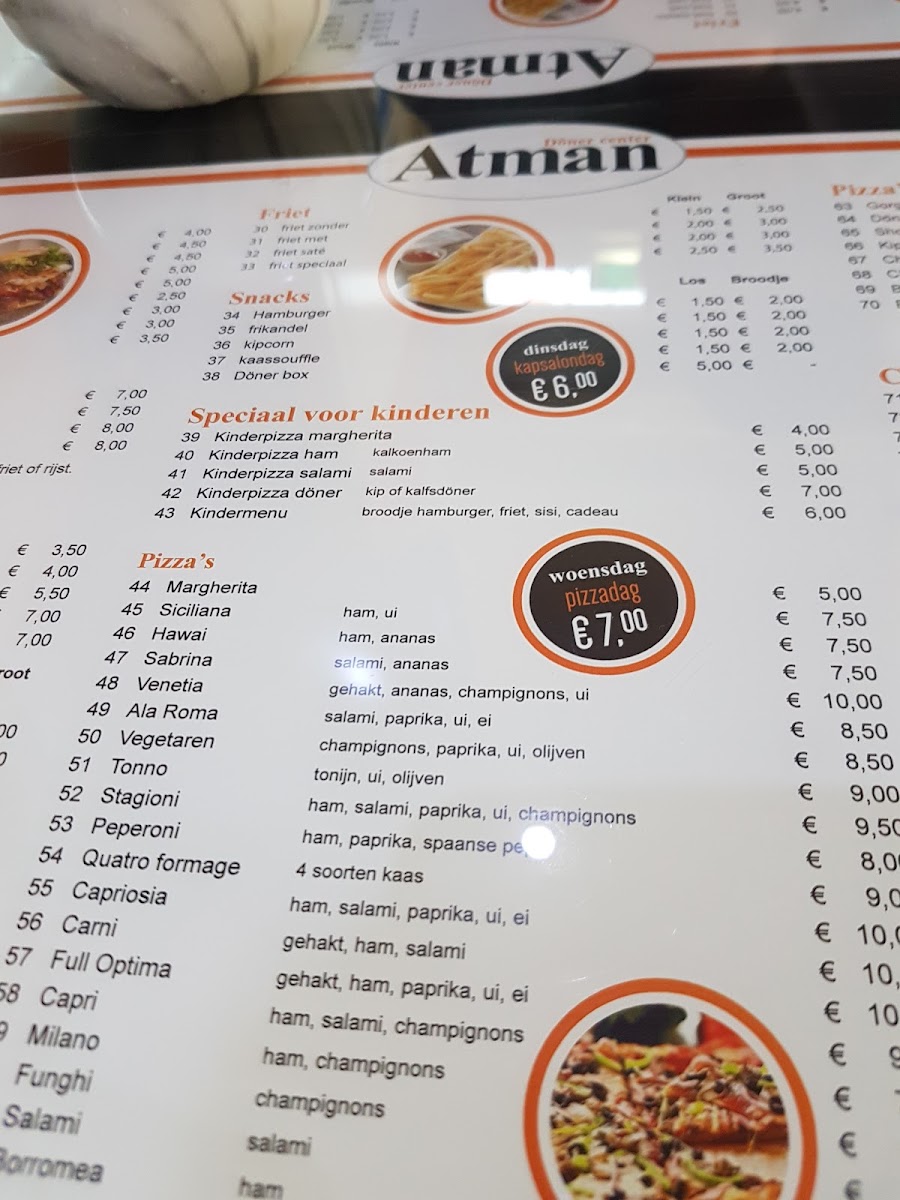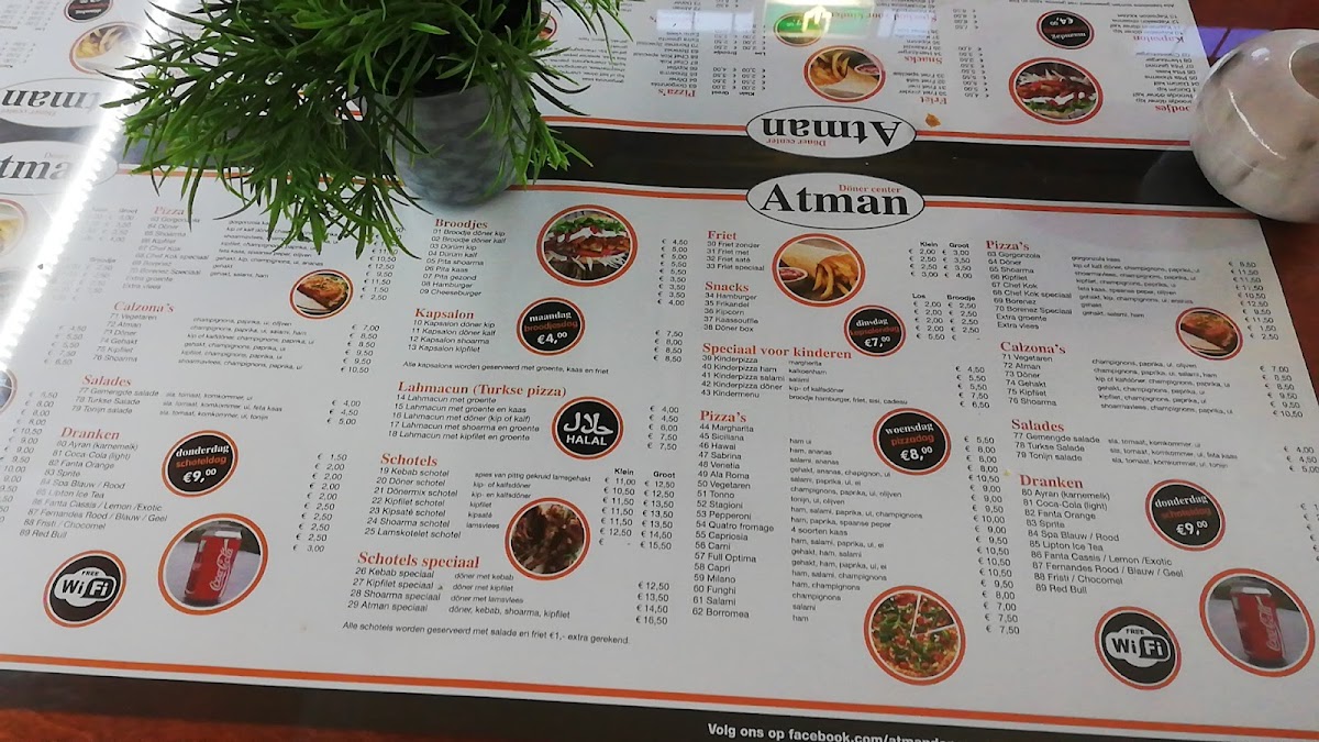 The menu at Döner Center Atman offers a satisfying variety of hearty and flavorful options, perfect for those craving Turkish-inspired fast food. One standout dish is the Kapsalon Kip, a delicious combination of tender chicken, crispy fries, fresh salad, and a generous layer of melted cheese, all topped with flavorful sauces. This dish is a true crowd-pleaser, filling yet balanced with its mix of textures and bold flavors. For those looking for something lighter, the restaurant also offers classic doner options, including doner wraps and plates, where customers can choose from chicken, lamb, or beef, all served with an assortment of fresh vegetables and sauces. Additionally, the menu features side dishes like the popular falafel and rice, making it a well-rounded dining experience. The prices are quite reasonable, considering the generous portions, making Döner Center Atman a great choice for both quality and value. Whether you're in the mood for a quick snack or a more substantial meal, the menu at this Oudenbosch gem has something to suit every appetite.